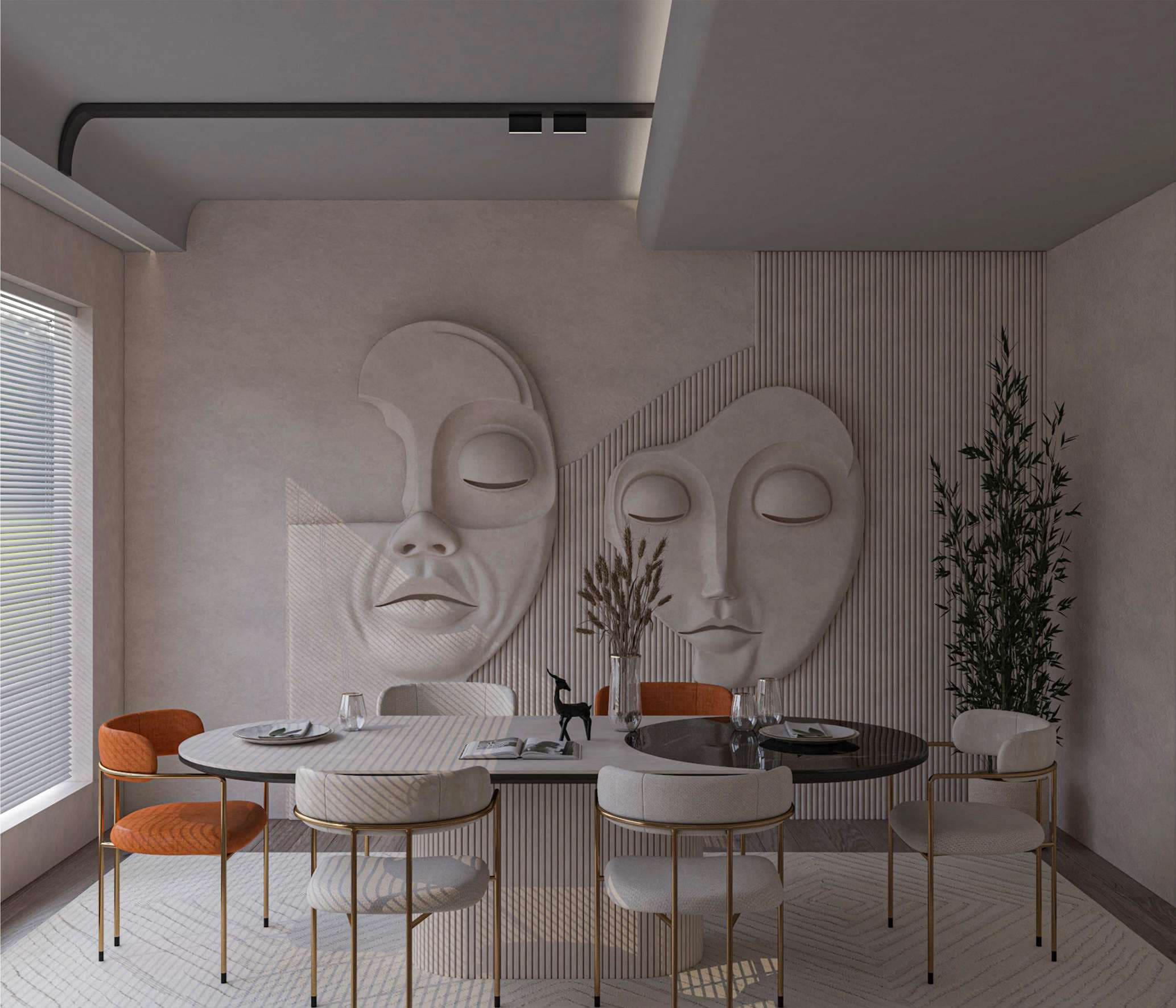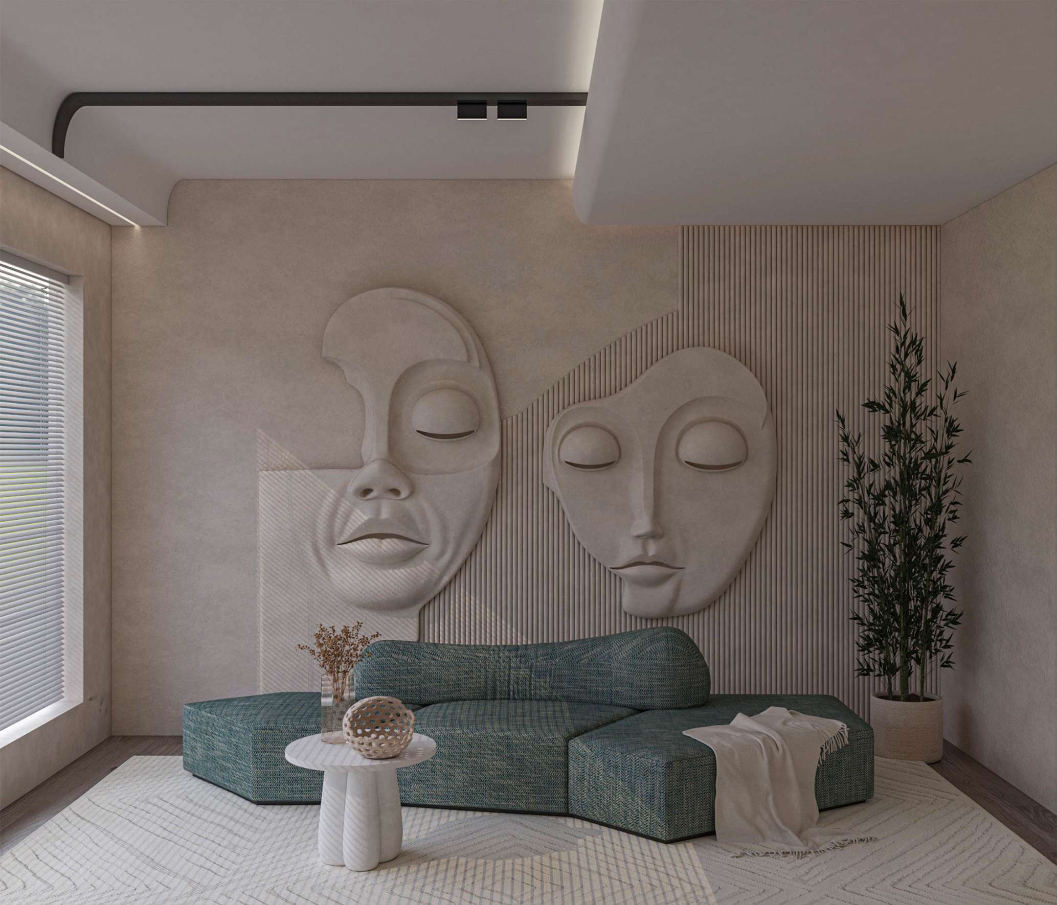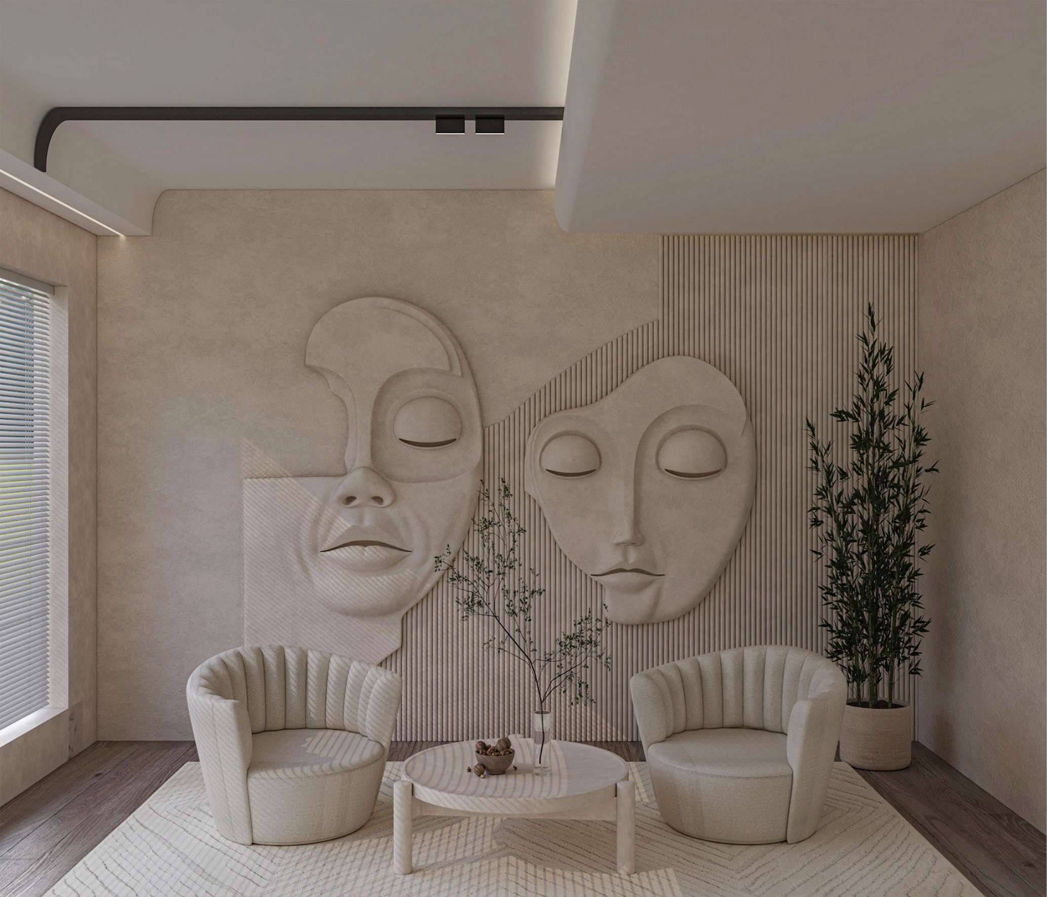 Set against a soft light beige backdrop, two artistic face sculptures take center stage, creating a quiet yet powerful focal point.